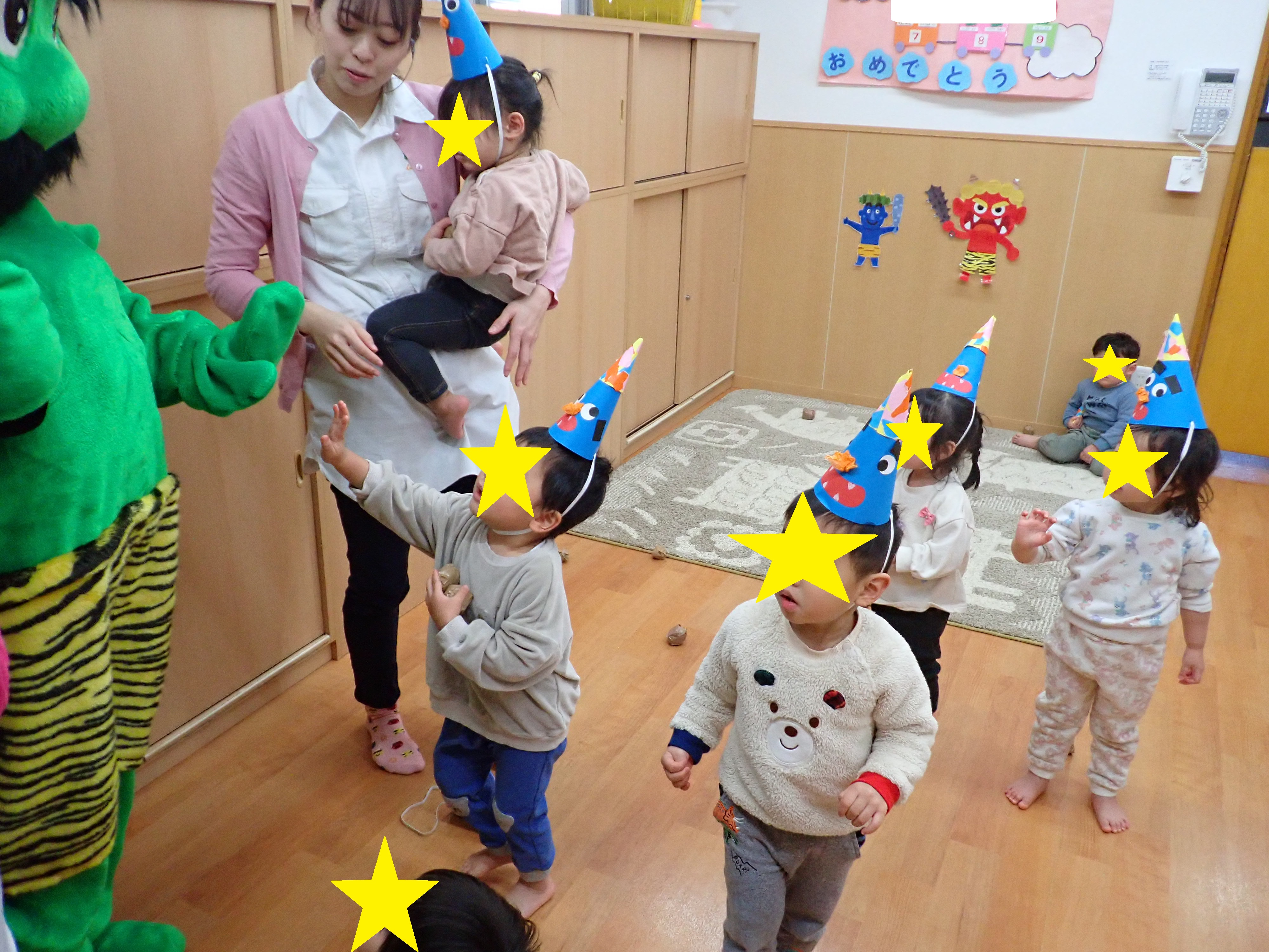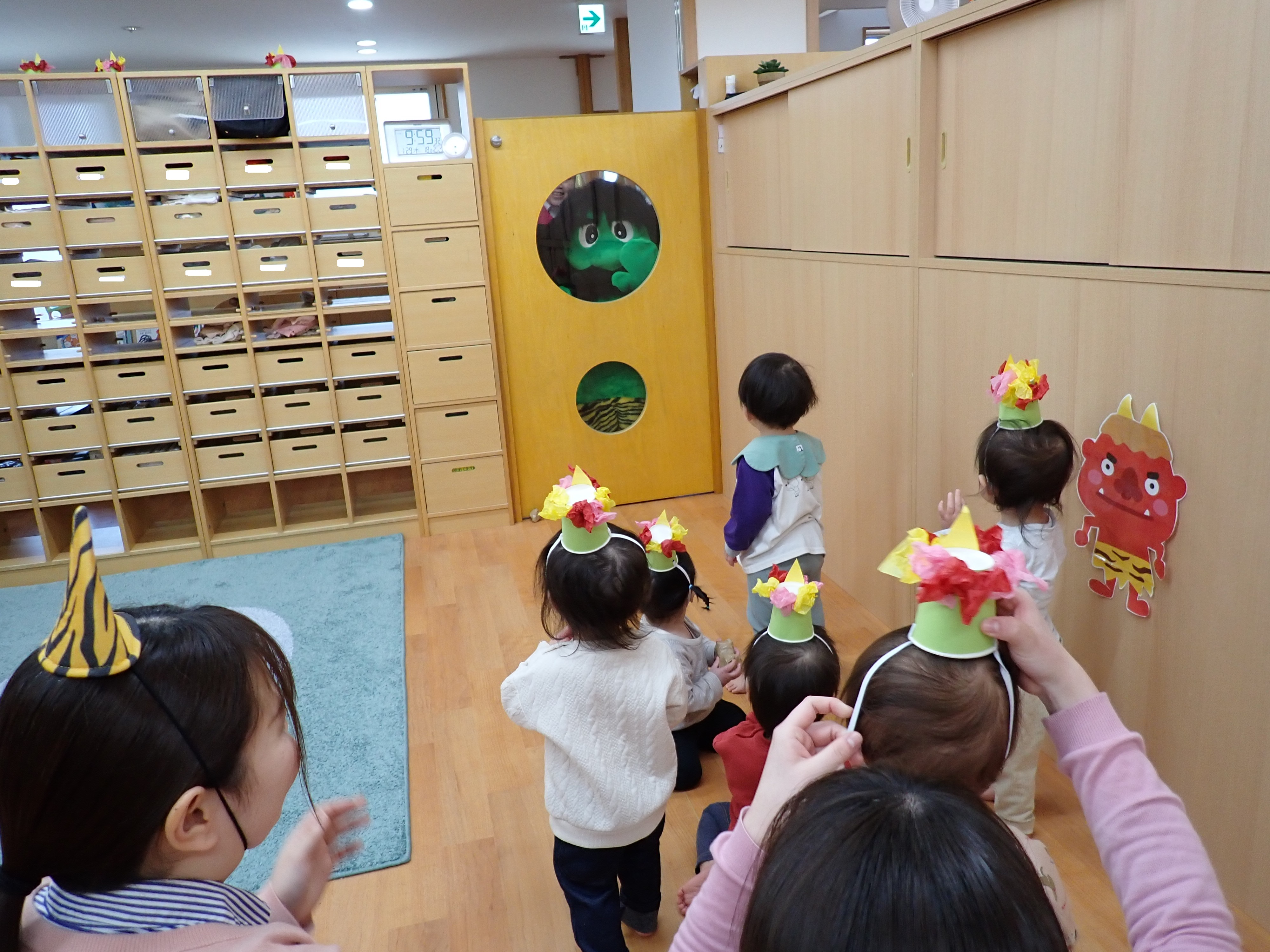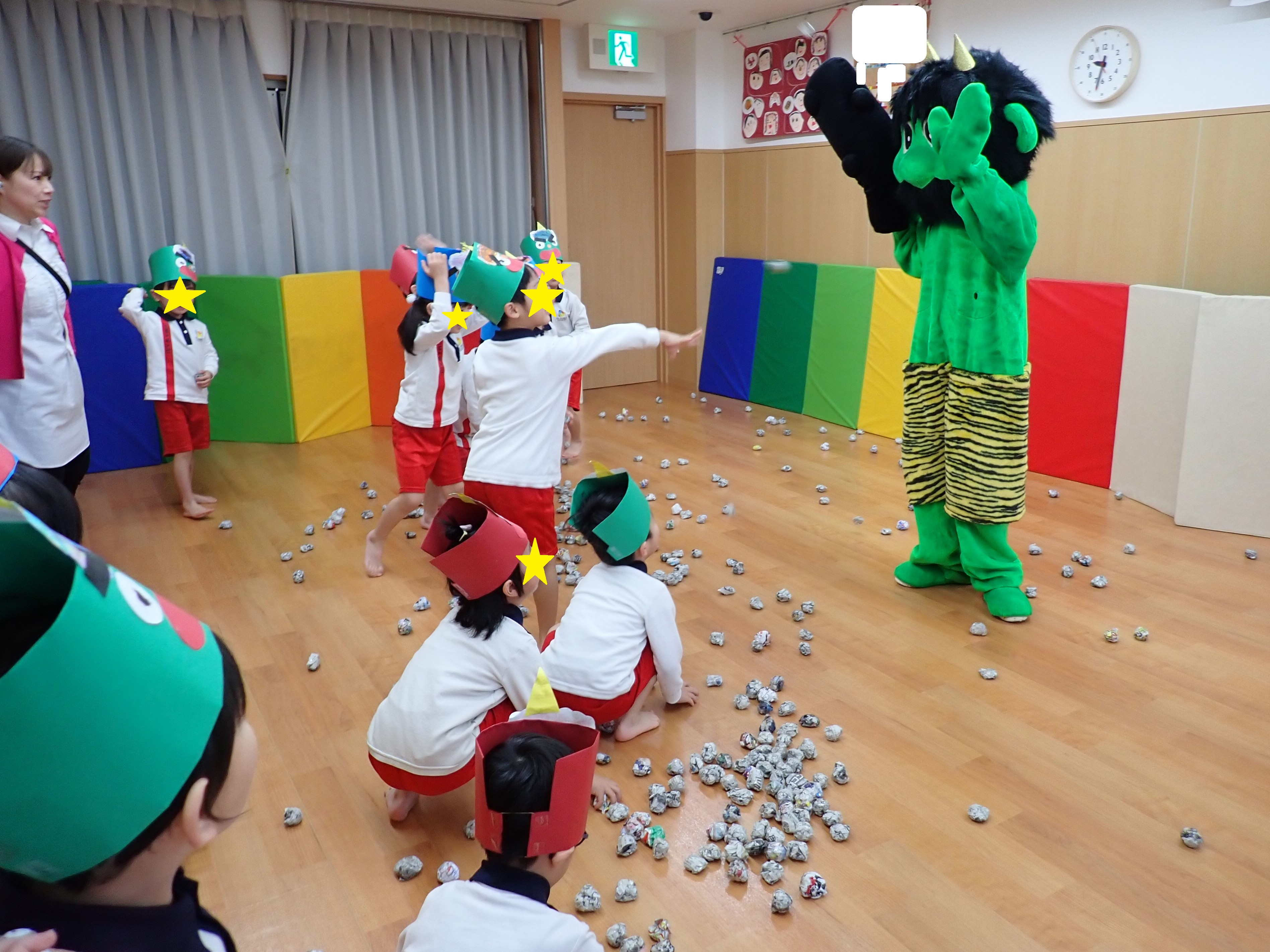 「鬼は外~!福は内~!」と声を掛けると、勇気を振り絞って握っている豆を「えいっ!」と頑張って投げていましたよ。怖くて先生にしがみついている子もいたり、先生の後ろから豆を必死に投げる子どももいたり、それぞれが頑張って鬼退治をしてくれました♪