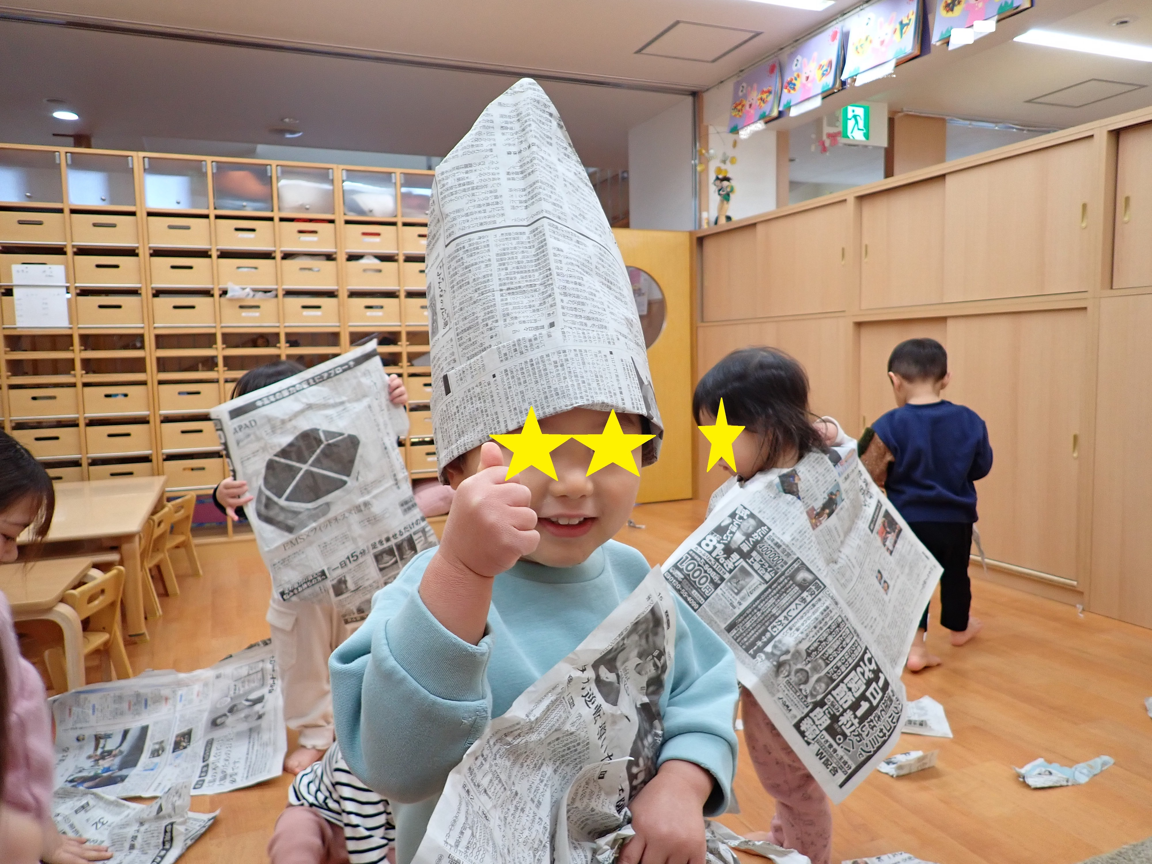 さて、1歳児ゆり組さんが先日新聞遊びをしていたのでその様子を紹介しますね♪
