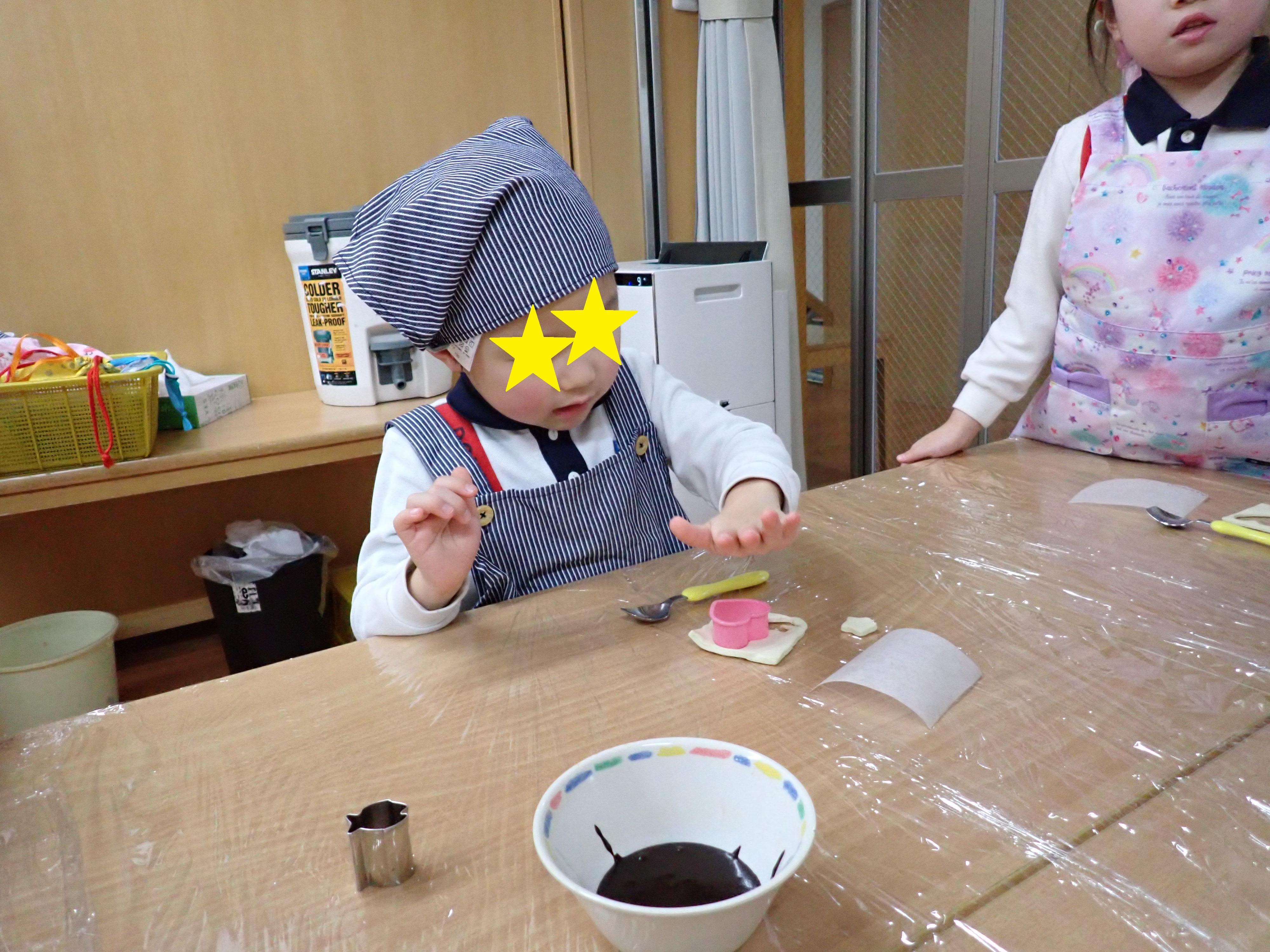 ハートの型抜きをして、ココアのソースでデコレーション。子どもたちは、エプロンと三角巾の準備をしどきどきわくわく♡