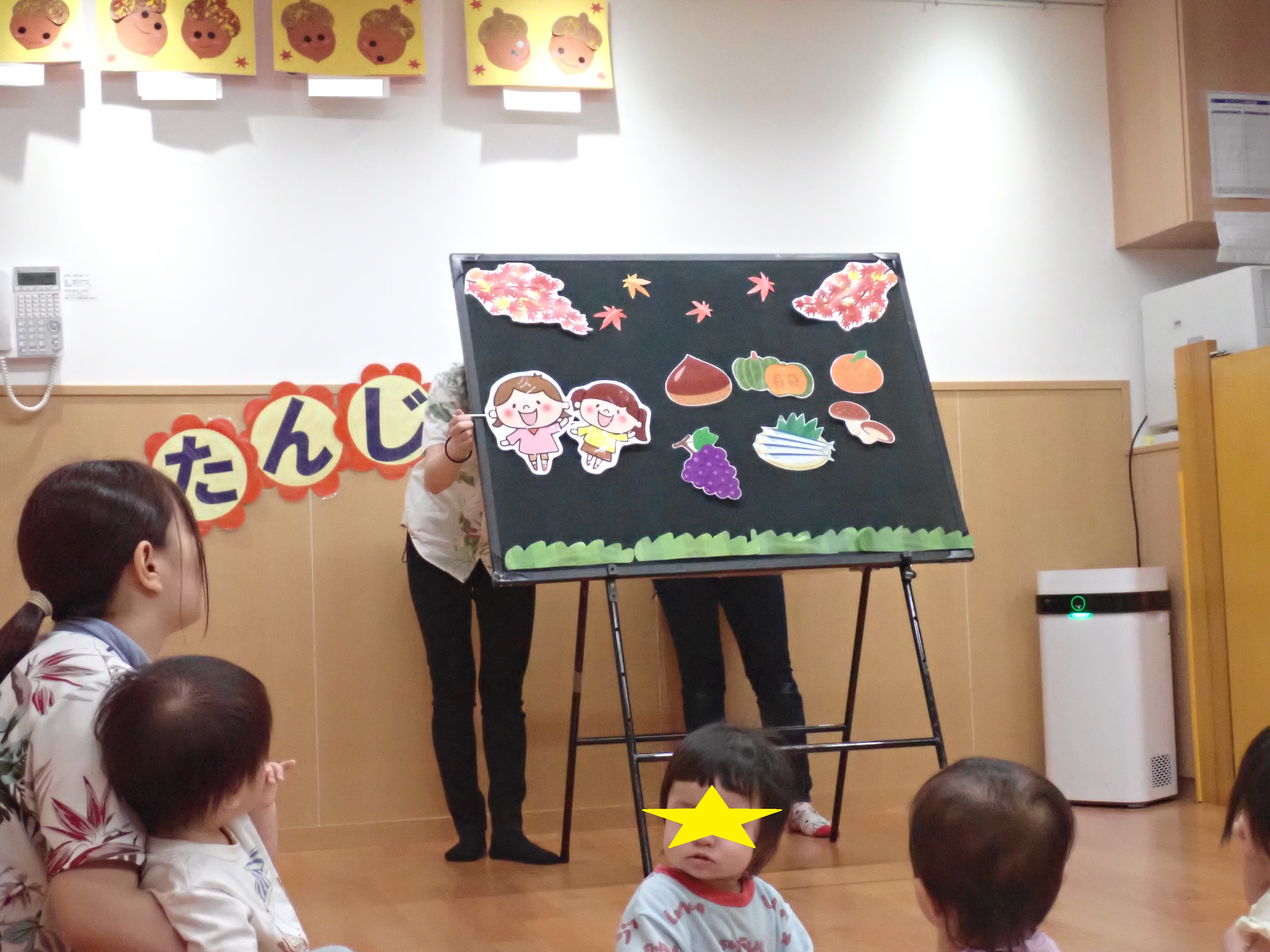 保育者からの出し物では、秋を感じるパネルシアターをしました。子どもたちも可愛いパネルシアターに興味津々。