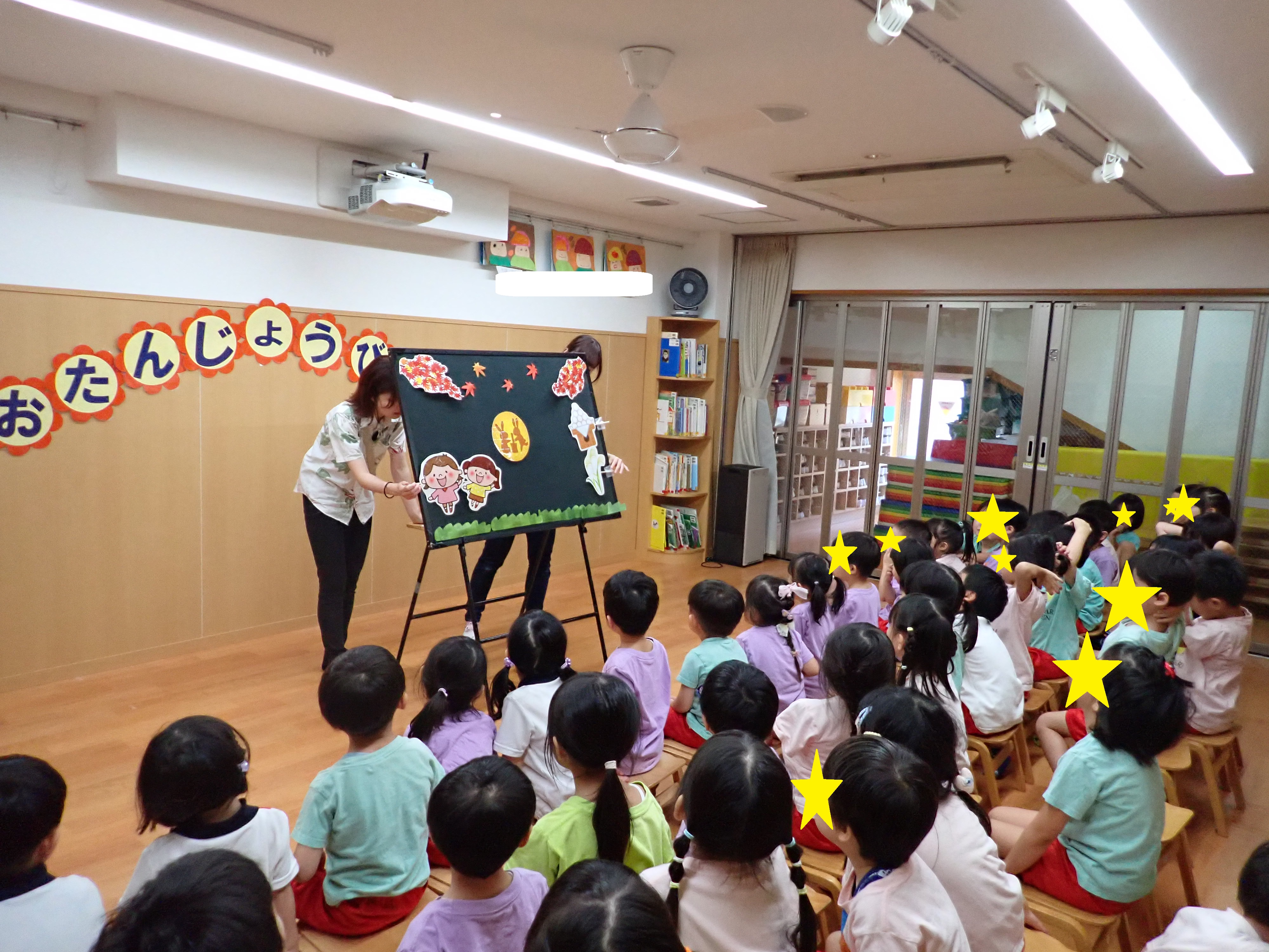 誕生児のお友だちは、前に出てお名前や好きな食べ物などインタビューをされるのですが少し緊張したり、笑顔で答えたりする姿が見られました♪