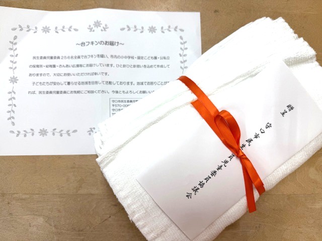 民生委員児童委員の方々が、ひと針ひと針思いを込めて縫ってくださる台フキンを今年もいただきました。