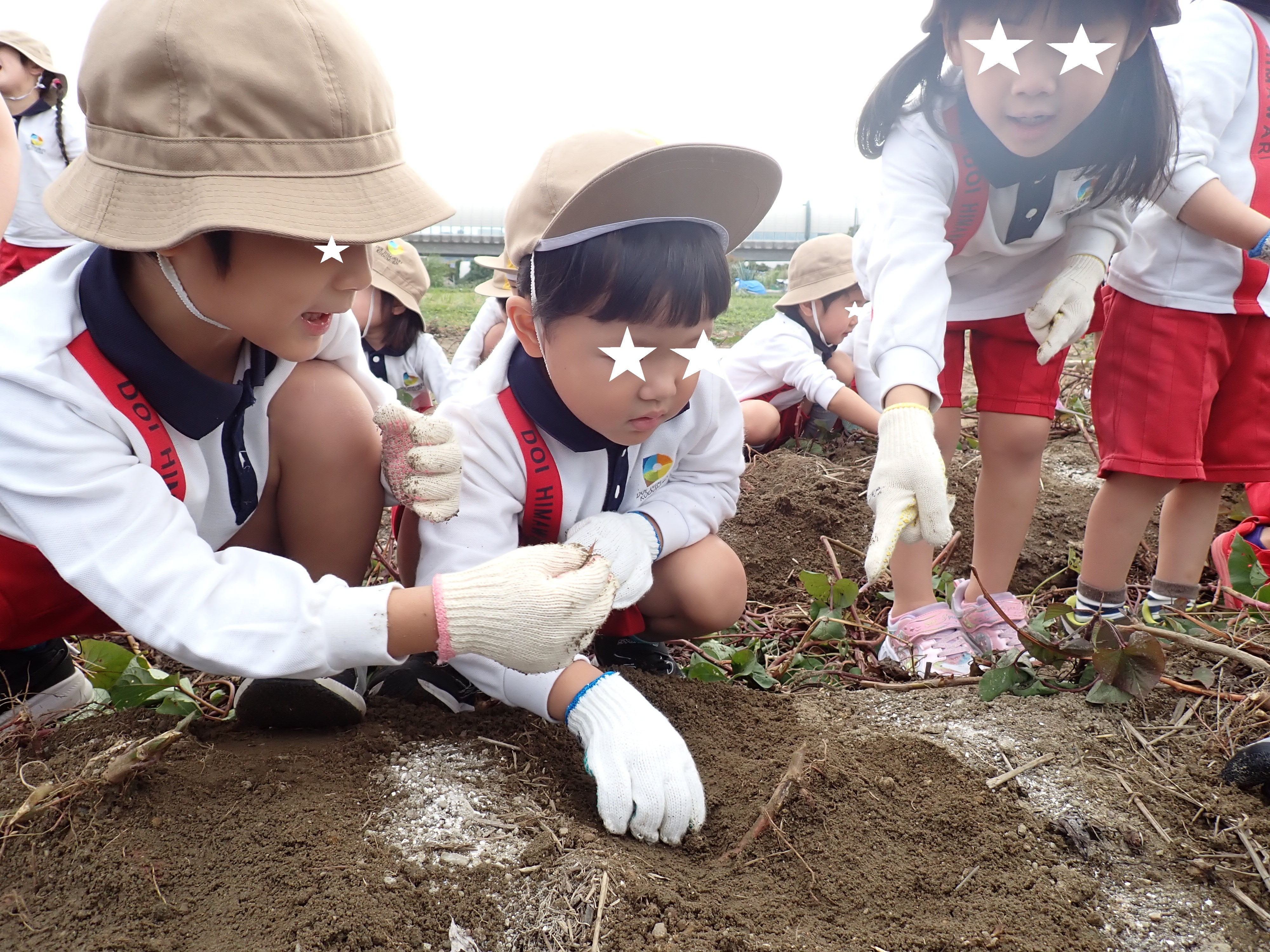 芋ほりでは、土の中から芋が顔を出すと力を込めて土を掘って、掘って掘って掘って…(;・∀・)簡単に抜けない芋に悪戦苦闘する姿も見られ、途中でカエルやバッタもピョンピョンと跳んできたので、子ども達は大騒ぎ。最後は先生にも手伝ってもらって無事に大きな芋をゲットすることができました(*´▽`*)