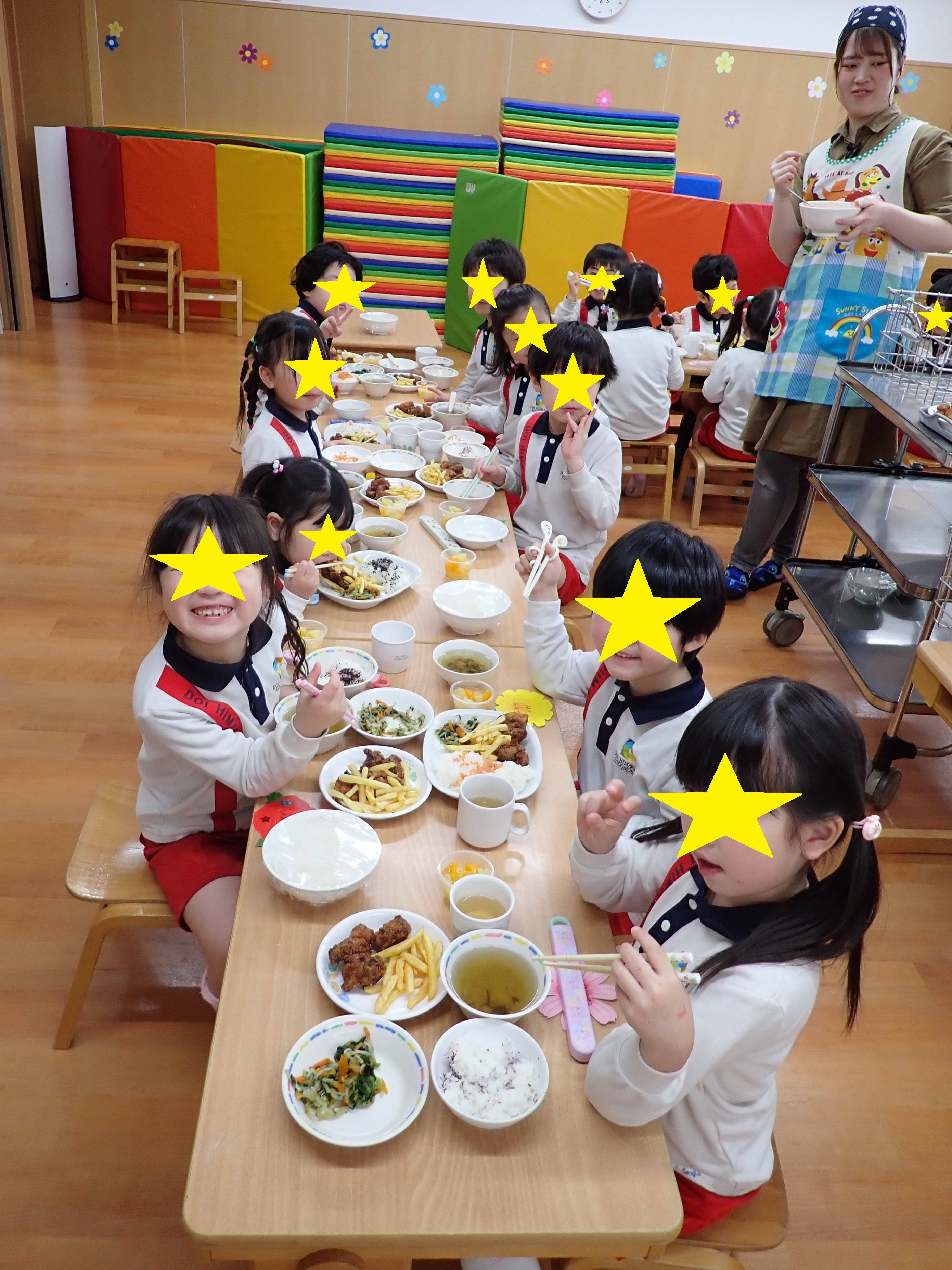 給食は、3歳児~5歳児のみんなで食べました。いつもと違う給食時間♪子どもたちもとっても嬉しそうでした♡