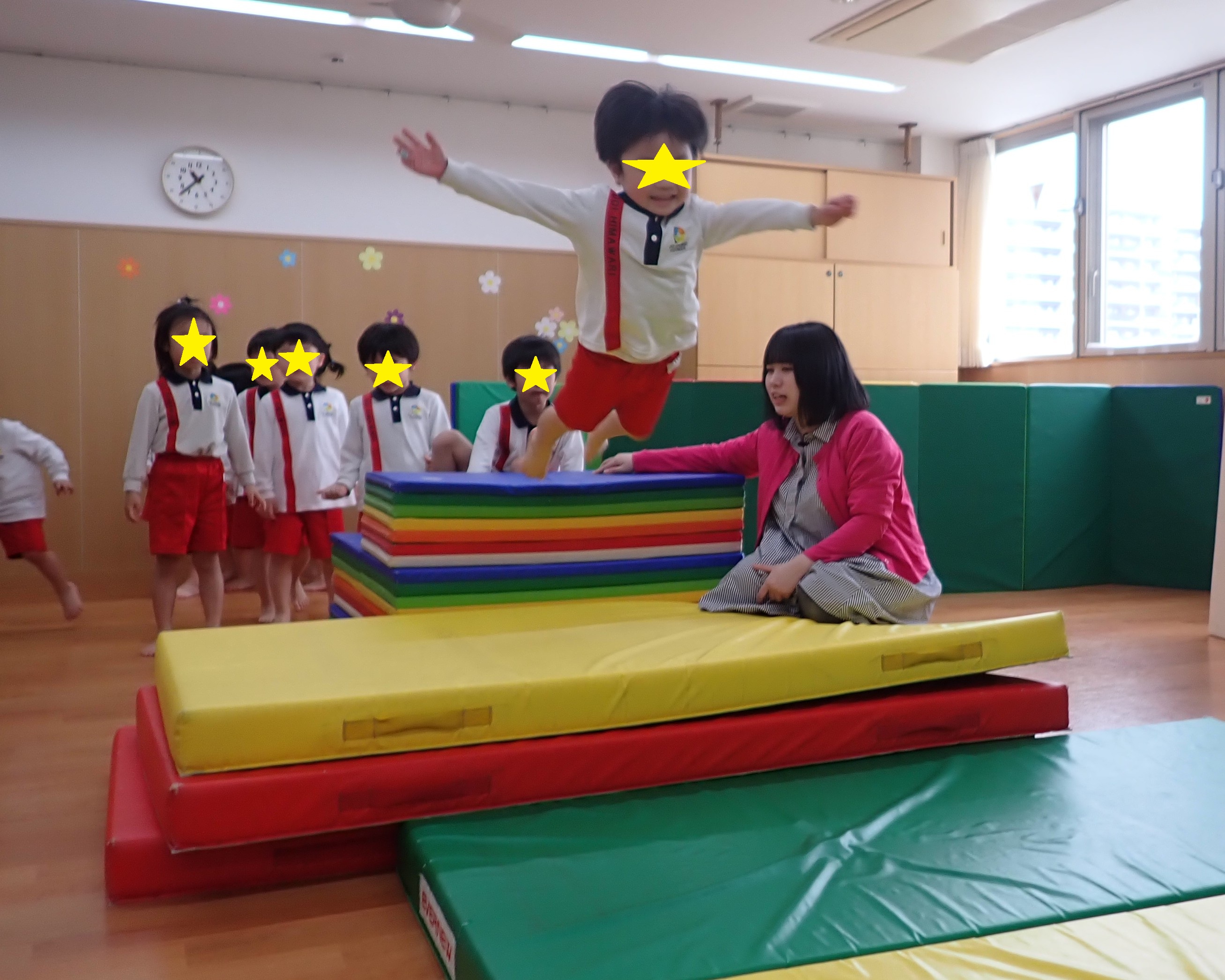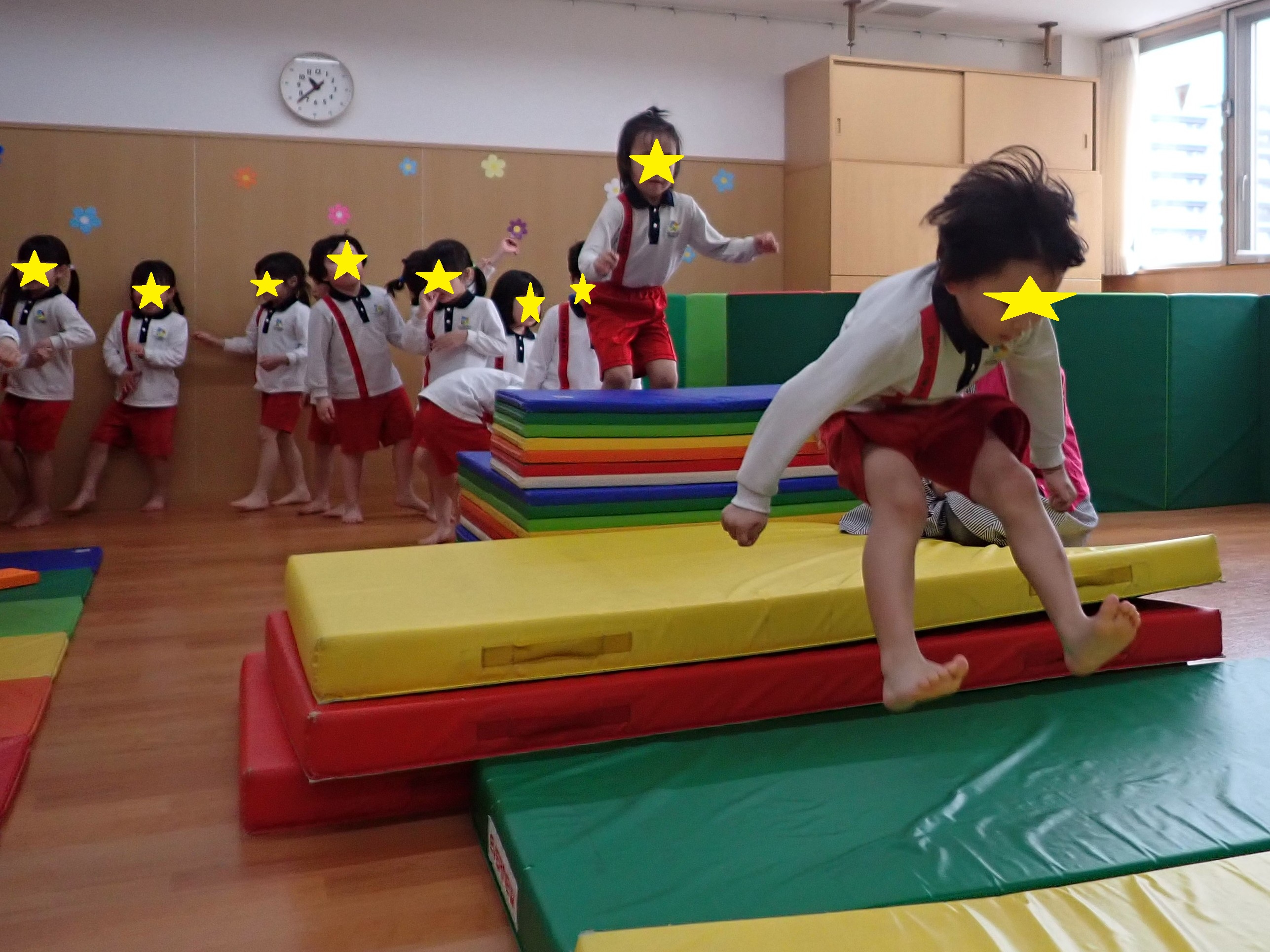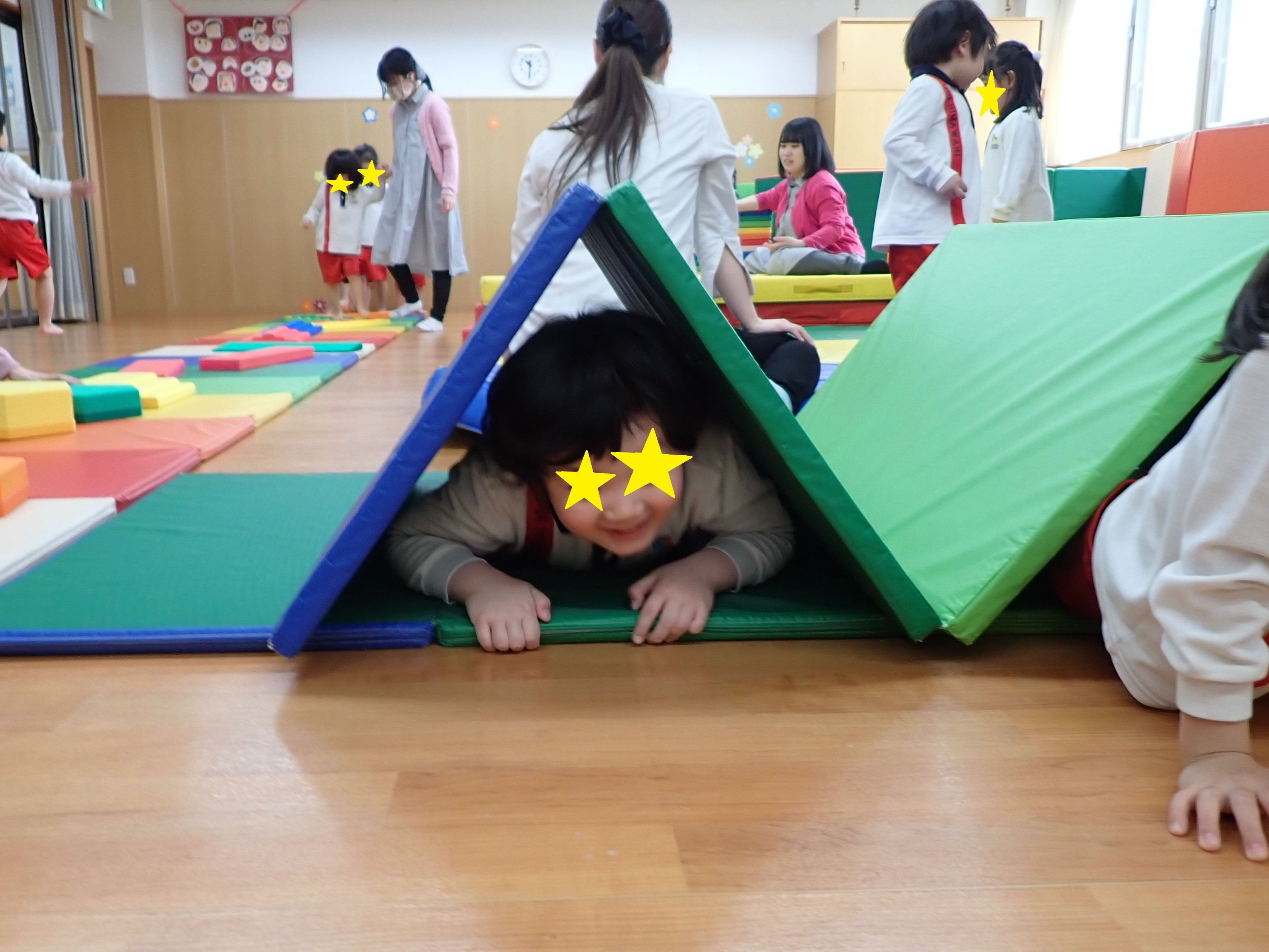 全員で準備体操をしたあと、カラーマットを敷いて、トンネルやジャンプ台、ジグザク道など、マット遊びをしましたよ!子どもたちは準備体操からテンションが上がっていましたよ♪